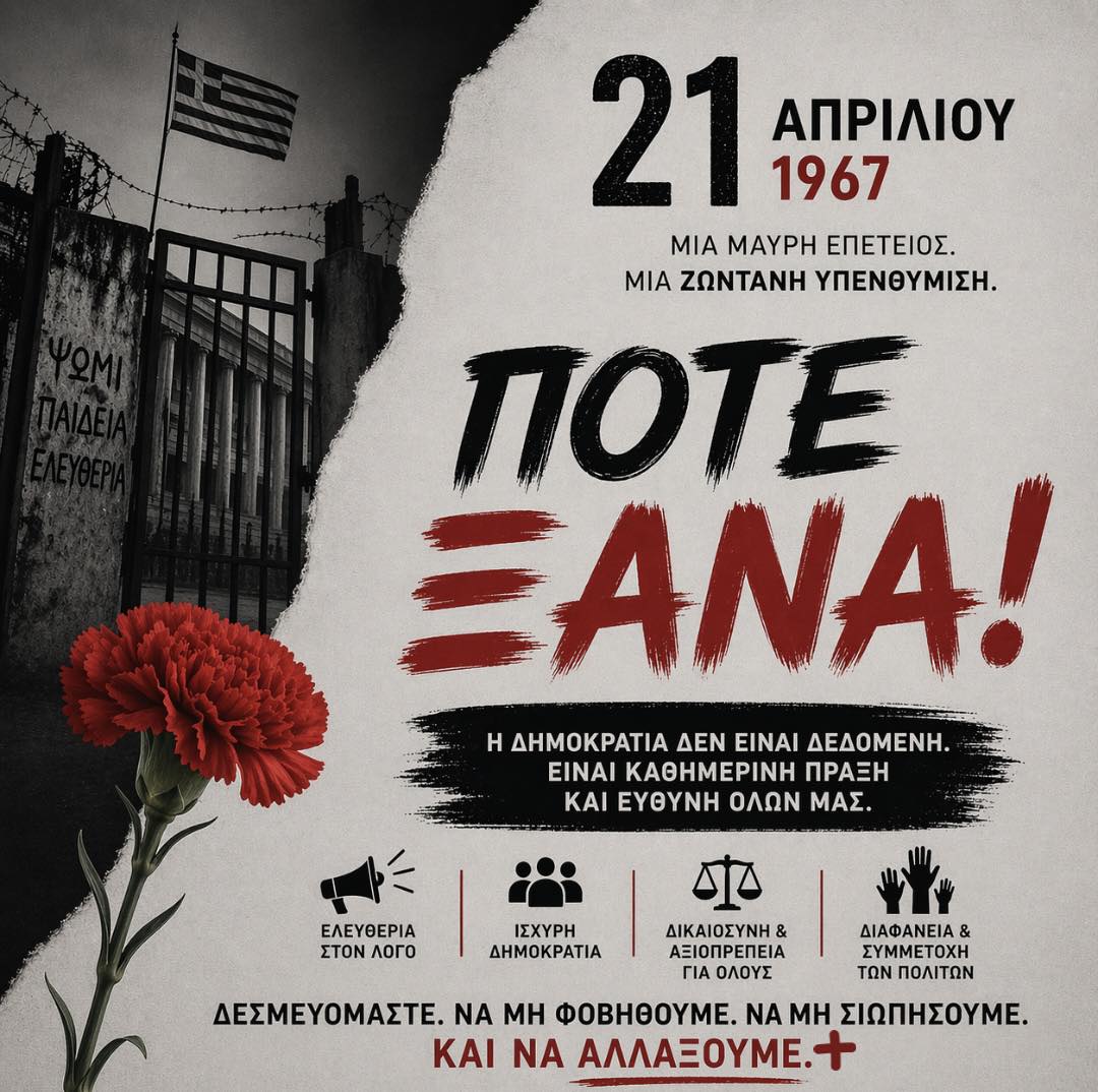 21 Απριλίου 1967: Ποτέ ξανά 21/04/2026 Η 21η Απριλίου είναι πάντα μια μαύρη ιστορική επέτειος για την πατρίδα μας. Ο αγώνας απέναντι στο φασισμό είναι πάντα ο αγώνας της μνήμης ενάντια στη λήθη. Και η επέτειος της 21ης Απριλίου είναι η ζωντανή υπενθύμιση του πώς μπορεί να χαθεί η δημοκρατία σε μια χώρα. Όχι […]